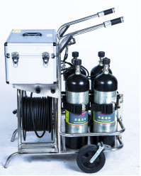 • 組成部件:長(zhǎng)管推車、長(zhǎng)管繞盤裝置、氣瓶、氣源分配器、減壓器、壓力顯示裝置、長(zhǎng)管、面罩、供氣閥、便攜式腰帶。